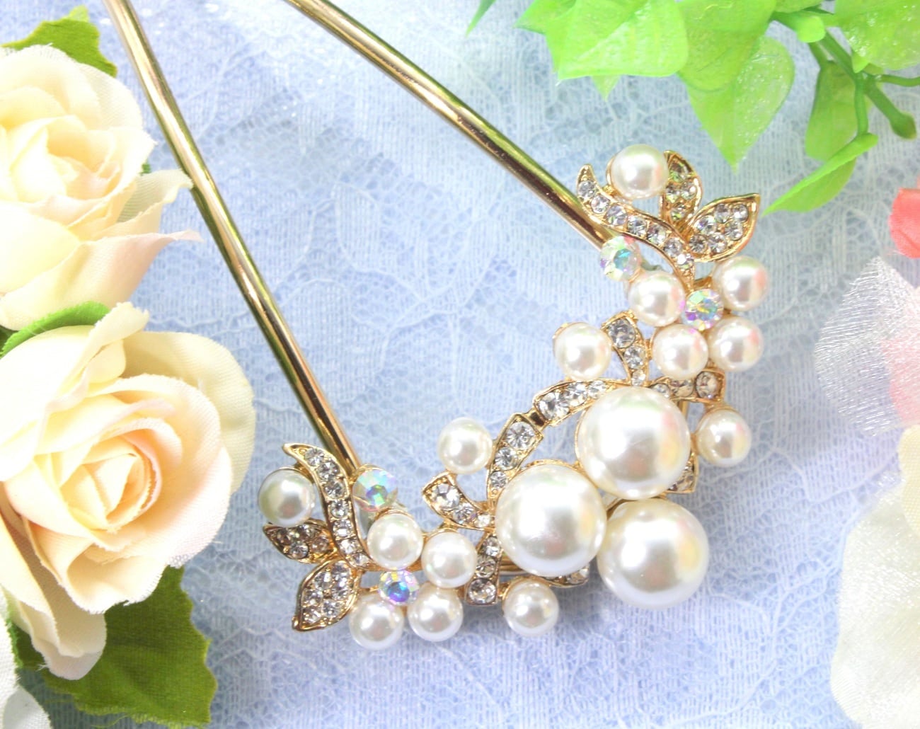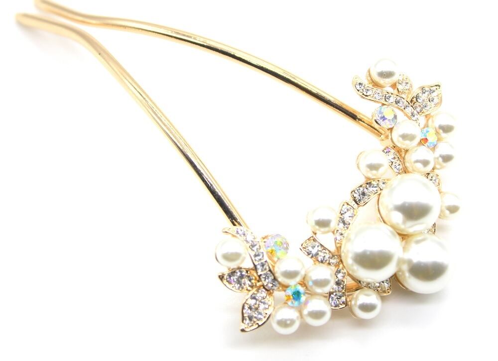 ◆華やかなボリュームのあるパールとラインストーンが優美でかわいいU型かんざしです。