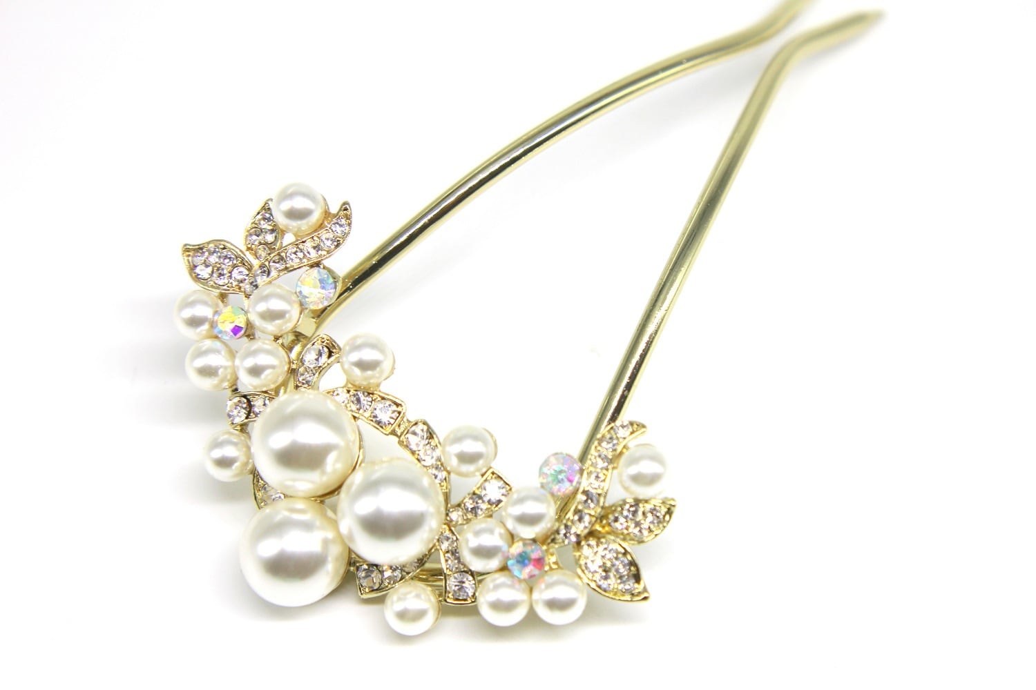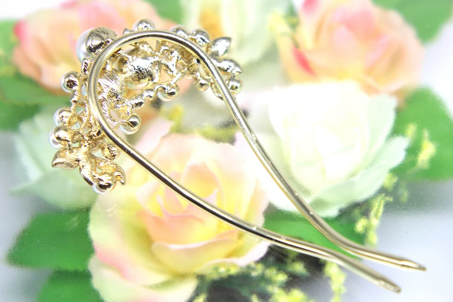 ◆華やかなボリュームのあるパールとラインストーンが優美でかわいいU型かんざしです。