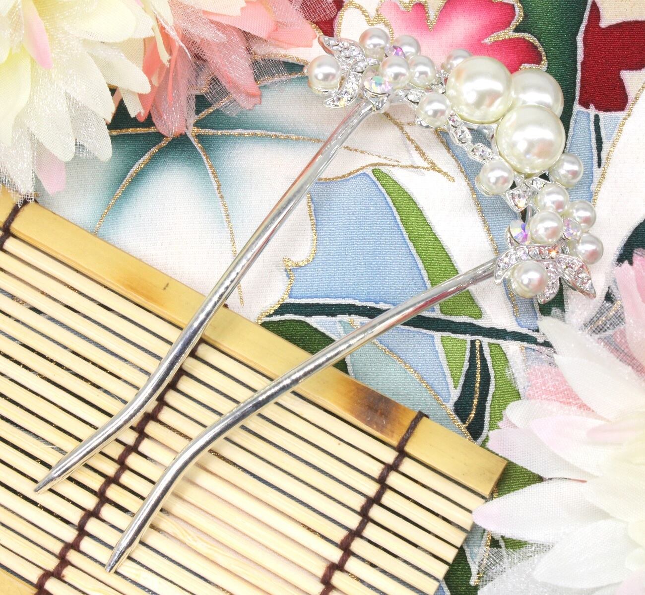 簪 かんざし 髪飾り 和装 パール 二本挿し CZ ダイヤ シルバー 銀