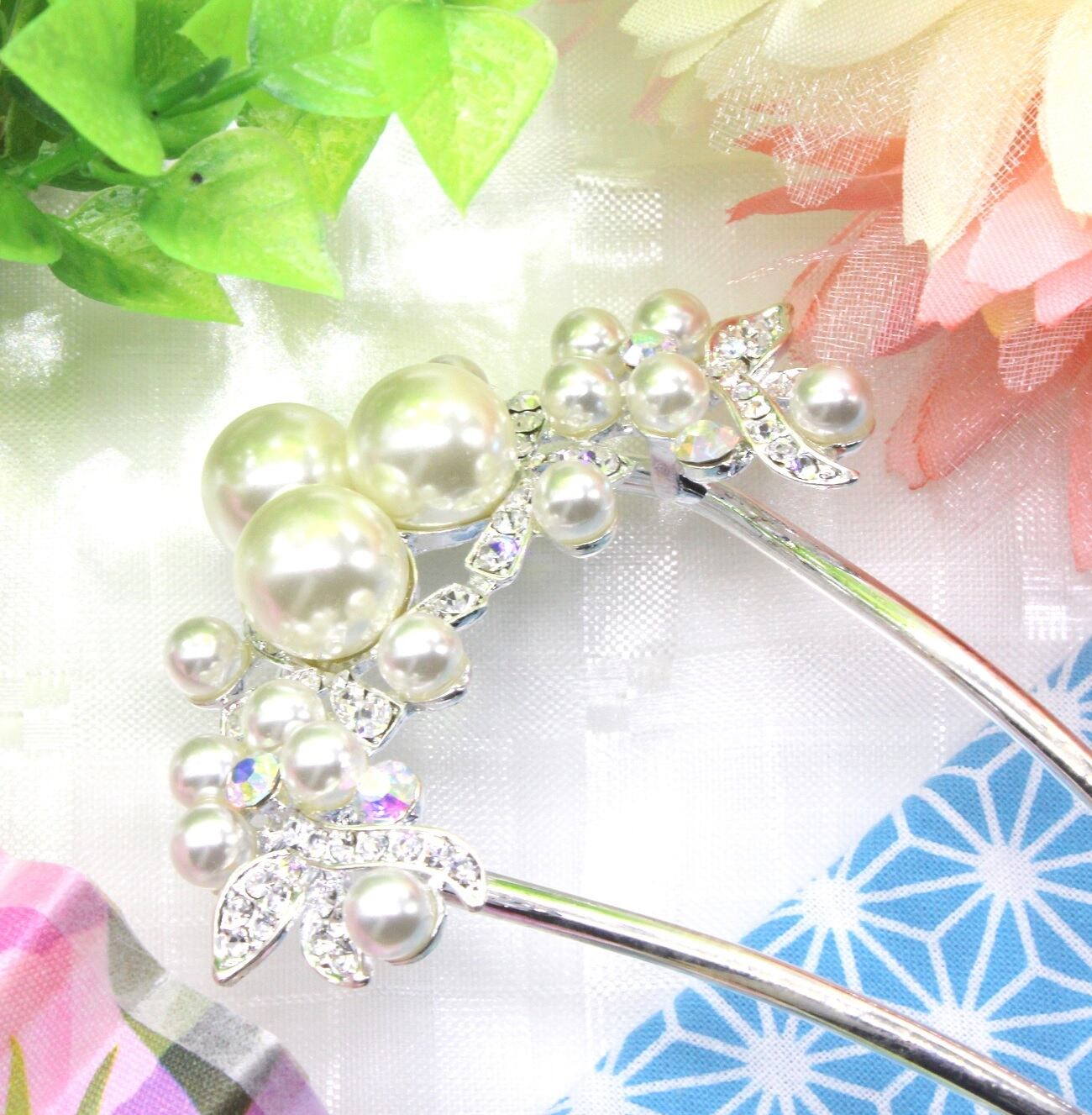 ◆華やかなボリュームのあるパールとラインストーンが優美でかわいいU型かんざしです。