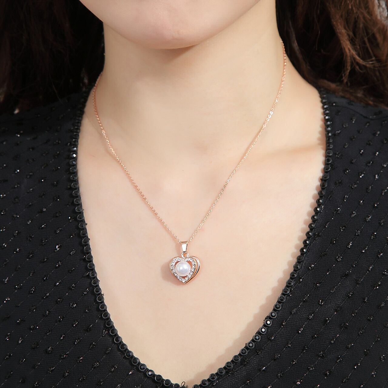 ◆キュービックジルコニアがハートを包み、存在感のある一粒パールのネックレス。身につけると女子力とがグンと上がります