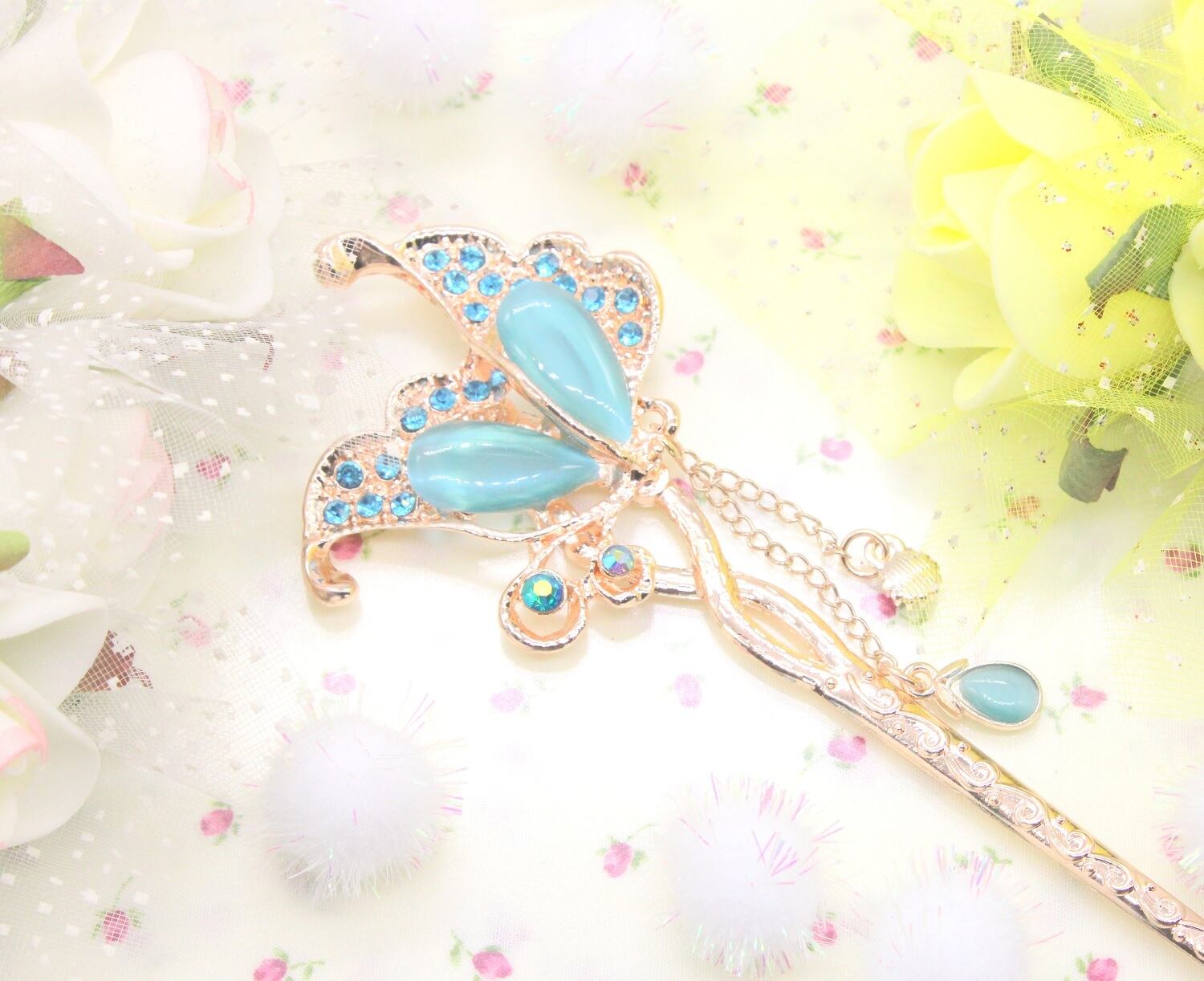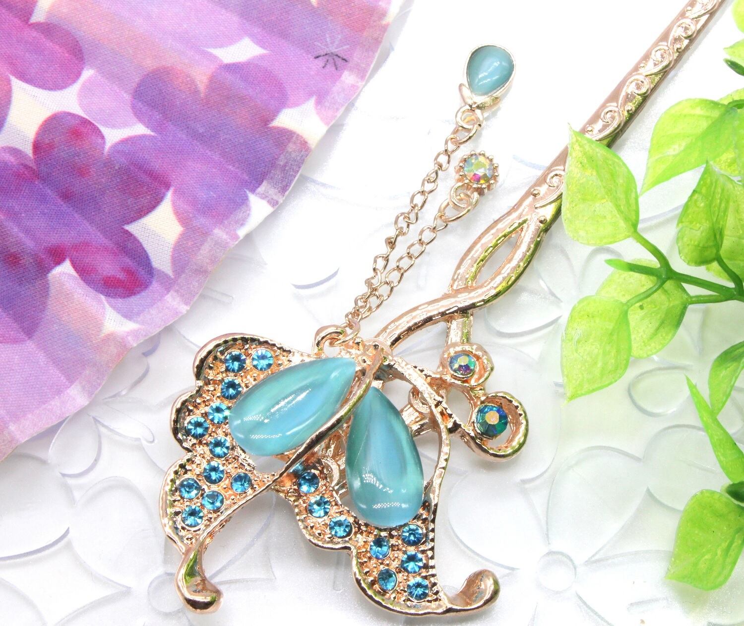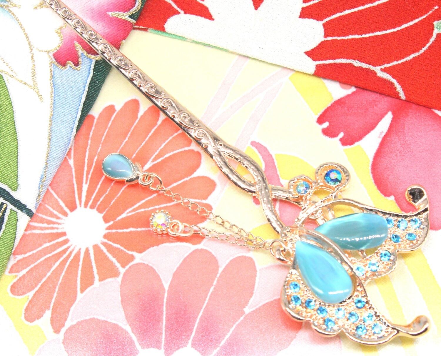 かんざし 一本 和装 アンティーク 髪飾り 蝶 花 フラワー ちょう ブルー 簪