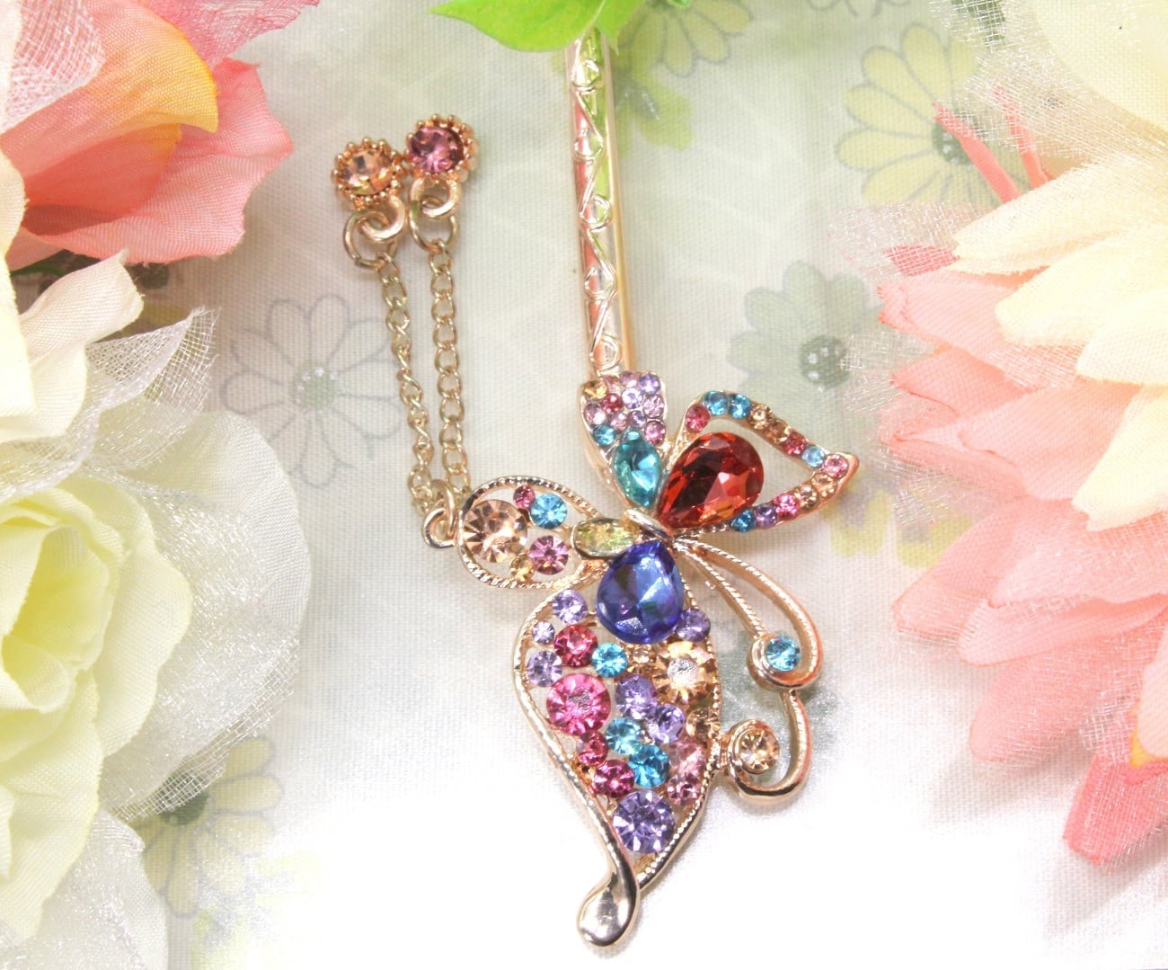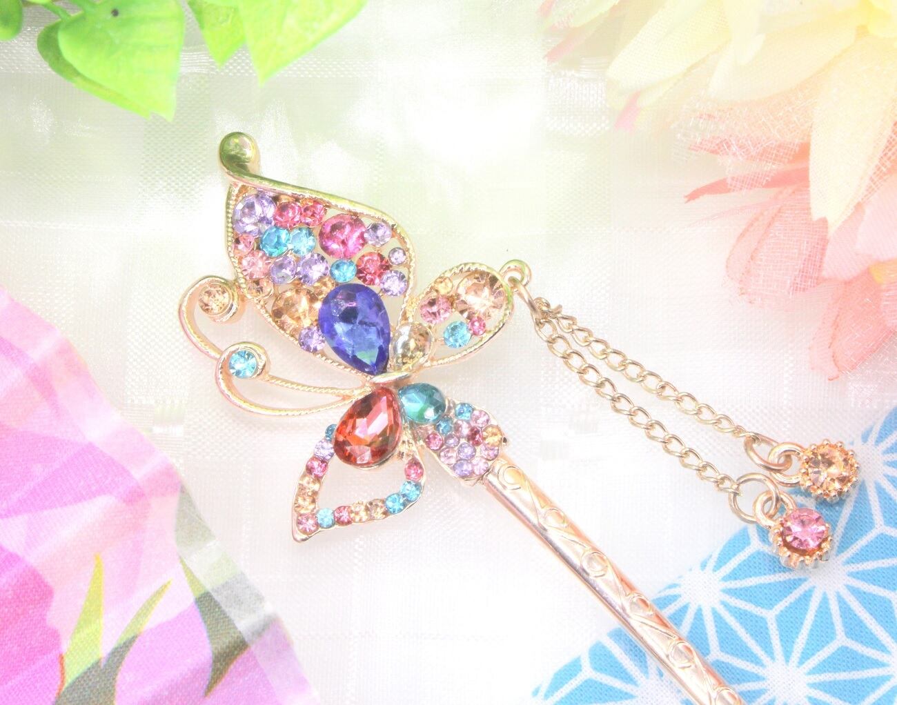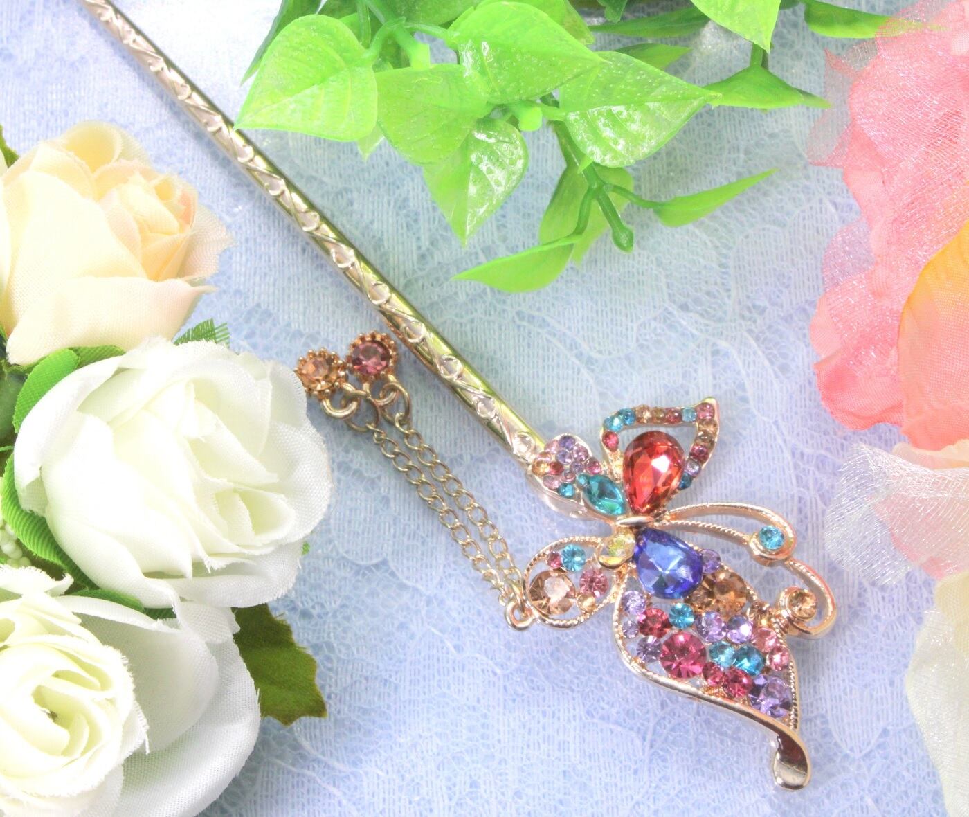 かんざし 一本 和装 髪飾り ピンクゴールド マルチカラー 花 ちょう 蝶 簪