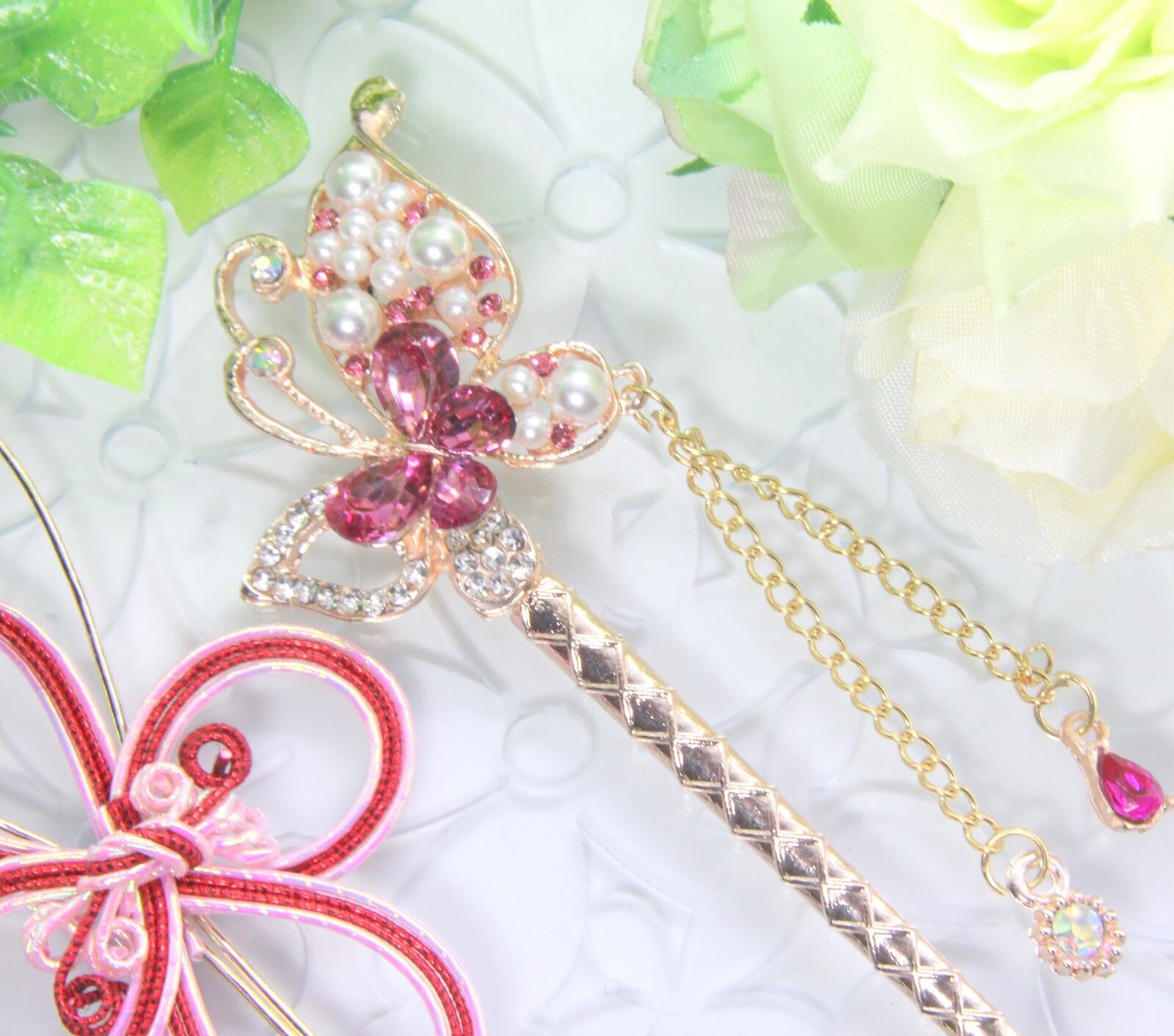 ◆ピンクゴールドのヘアスティックに人気モチーフの蝶々&フラワーデザインは日本の和の伝統的女性の美を演出してくれます。