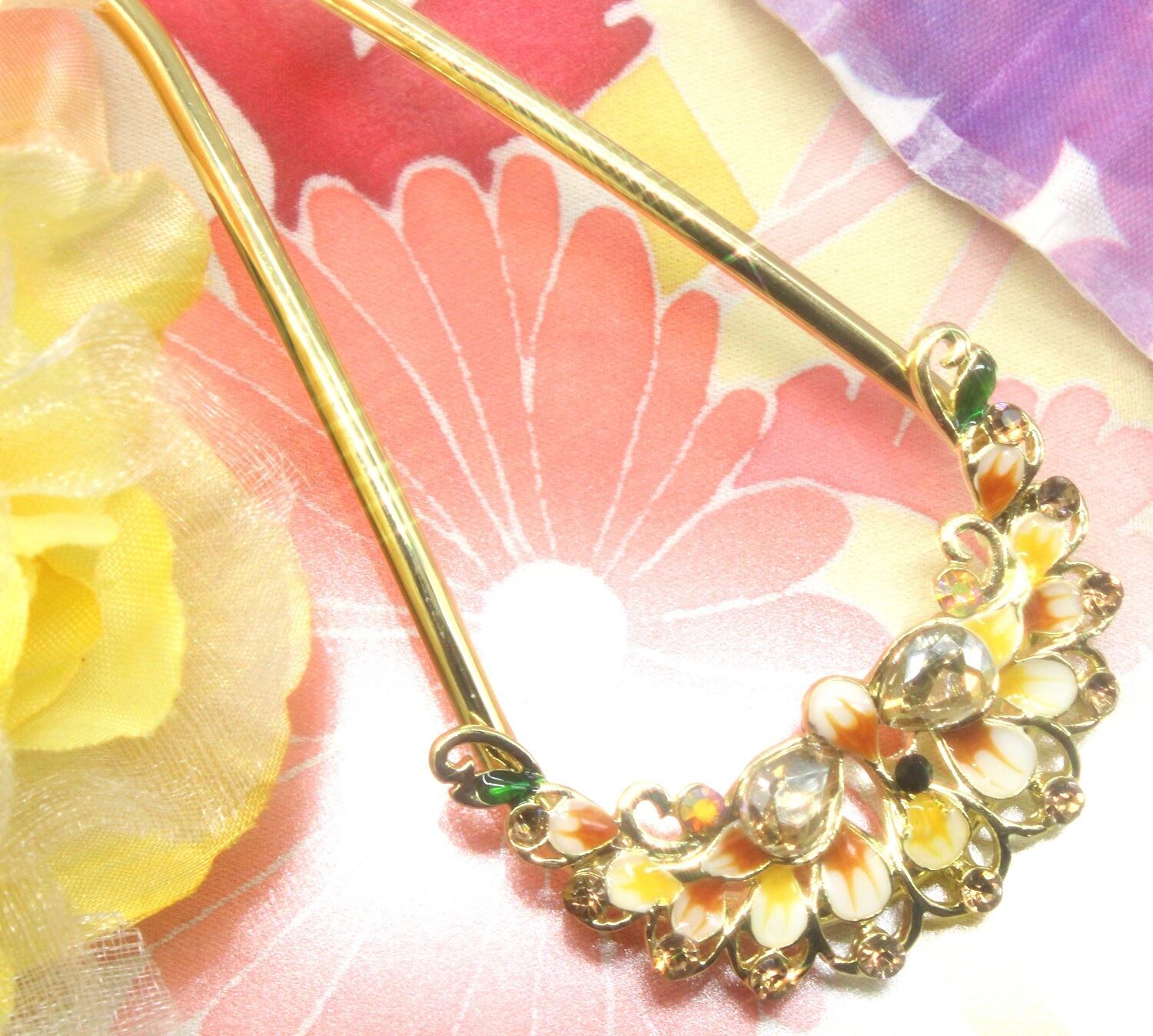 ◆アンティーク調で華やかな二本挿しかんざしです。訪問着、附下、黒留袖、色無地、小紋、等の着物に合わせて、パーティー、フォーマルなシーンや結婚式のまとめ髪や日本髪、夜会巻きにも活躍してくれます。