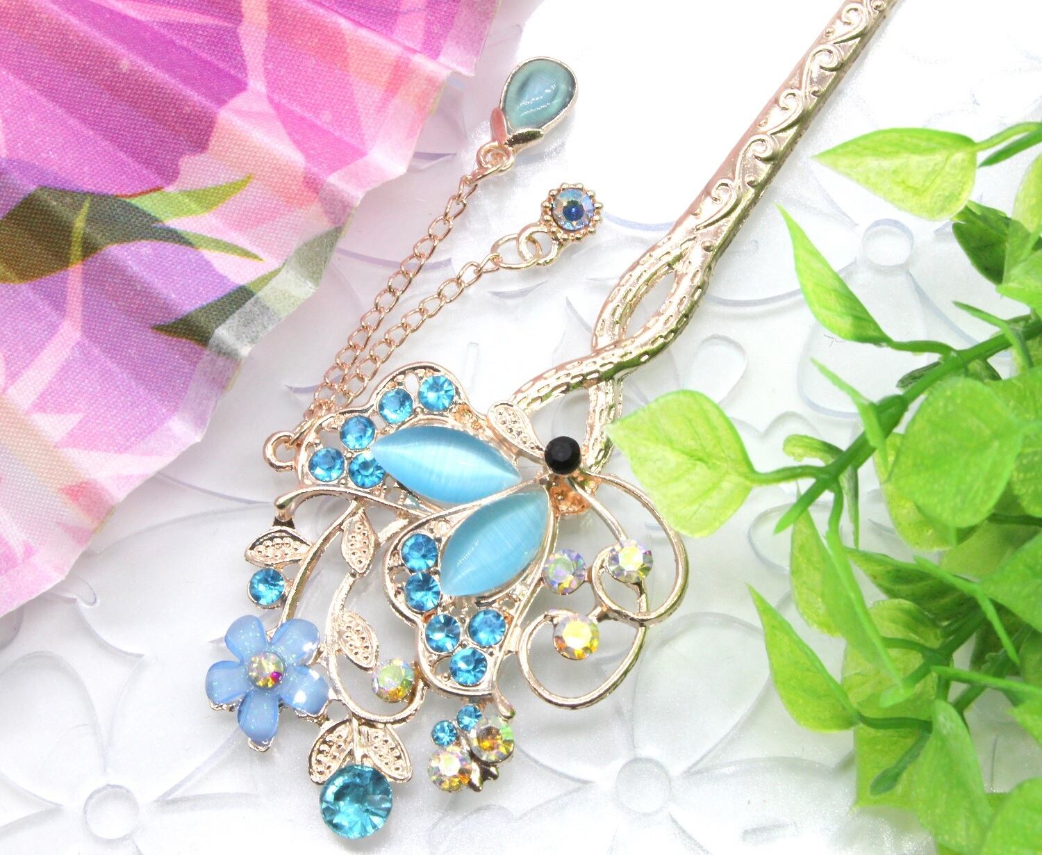 かんざし 一本 和装 着物 金属 アンティーク 蝶 ちょう ブルー 花 簪