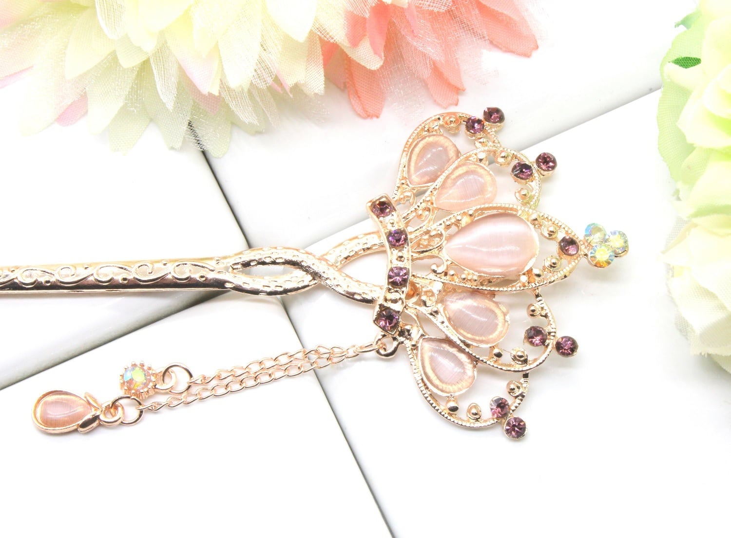 ◆ピンクゴールドのヘアスティックに人気モチーフのティアラ&フラワーデザインは日本の和を愛する女性の美しさを演出してくれます。晴れの舞台や普段使いで20代の女性から40代以上のお母様のヘアアクセサリーのワンポイントとしても数多くお喜びの声が届いています。