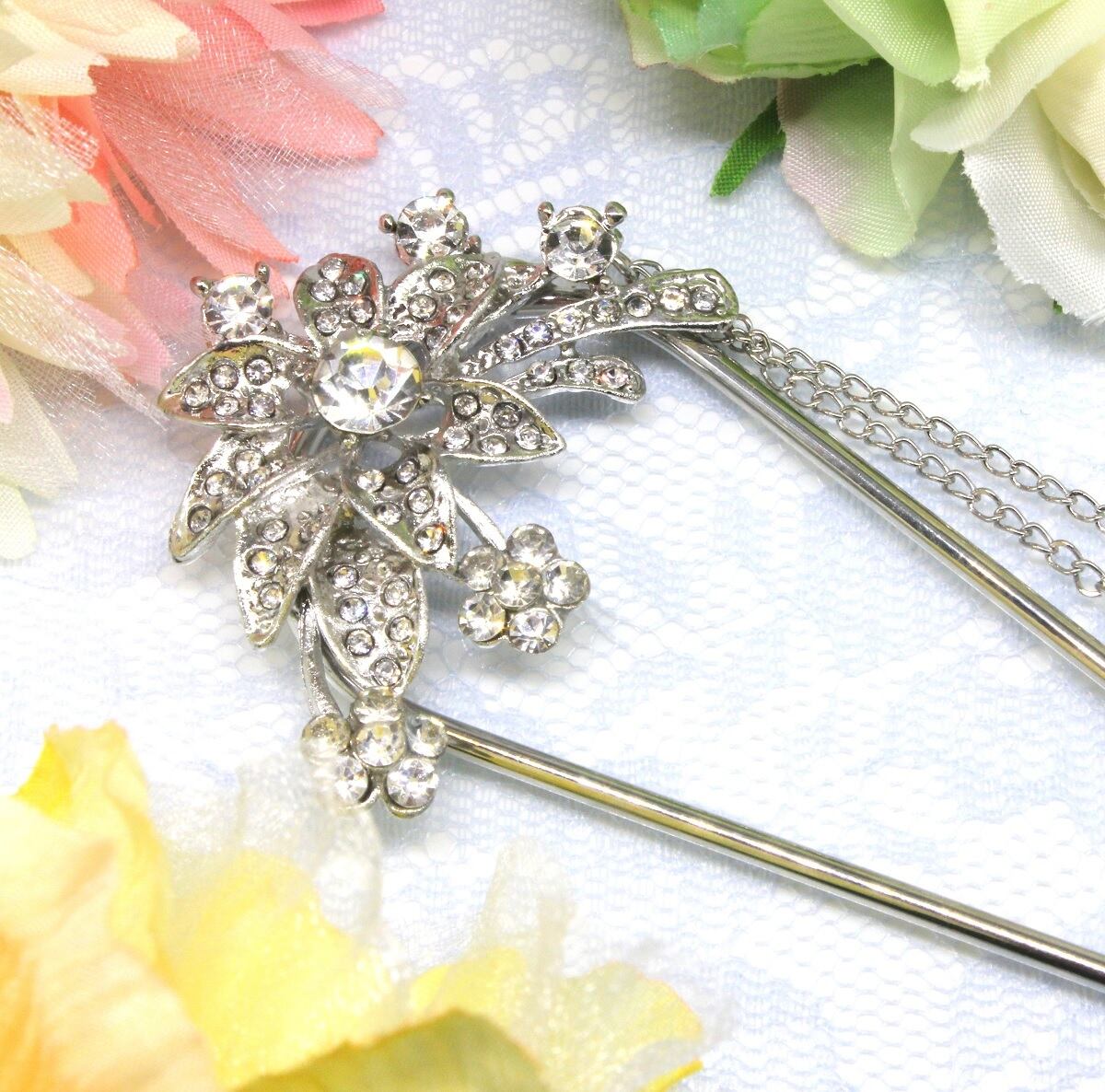 訪問着、黒留袖、色無地、袴、振袖、等の着物に合わせて、また和傘、浴衣、和服コスプレのご使用時のワンポイントとして、パーティー、フォーマルなシーンや結婚式の洋装のまとめ髪や夜会巻きにも活躍してくれます。金属製で壊れにくく、軽量で繰り返しお使いできる二又かんざしです。